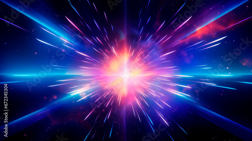 © YM Creative Studio, Naklejka premium A neon glow of abstract colors illuminating the backdrop, depicting a cosmic explosion and the rapid motion of light within a galaxy. Generative AI