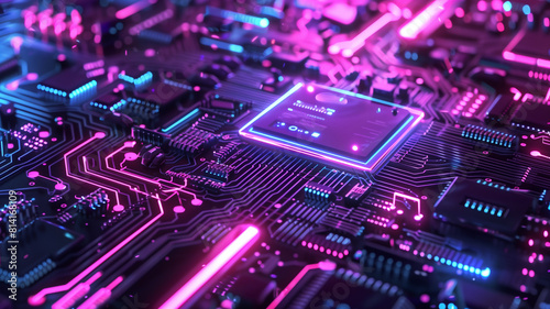 Obraz premium .A neon-lit circuit board with illuminated pathways that mimic a futuristic...