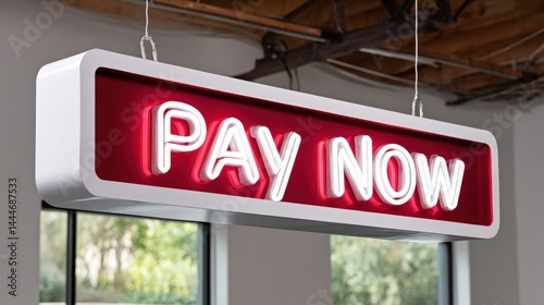 © Preecha, Obraz premium A neon-lit sign reading "Pay Now" suspended in mid-air, bold and striking