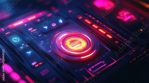 Obraz premium A neon-lit smart button embedded in a futuristic control panel, designed for...