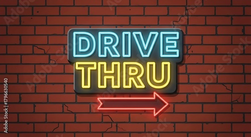 © Leo, Obraz premium A neon sign, rectangular in shape, displaying "Drive Thru" with an arrow, mounted on a brick wall. The sign has a colored outline