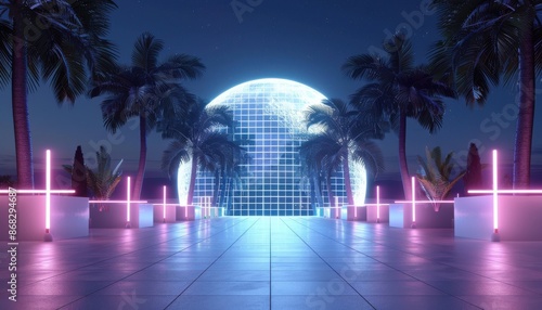 © AnuStudio, Naklejka premium A neon sign with a globe in the middle of a walkway with palm trees