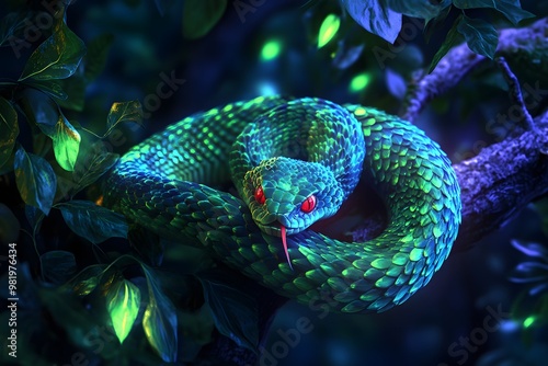 Obraz premium A neon snake, glowing in shades of green and blue, coils around a glowing tree branch. Its eyes glow bright red, and its scales shimmer with neon light, reflecting off the dark forest background