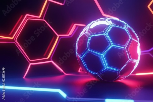 Fototapeta premium A neon soccer ball is surrounded by a colorful hexagonal pattern