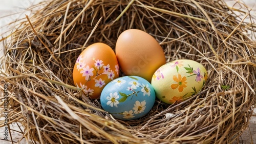 Obraz premium A nest of straw with Easter eggs decorated