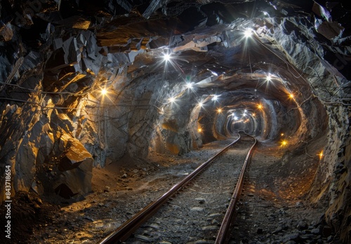 Naklejka premium A network of underground mining tunnels illuminated by bright lights, showcasing the rocky walls and mineral veins