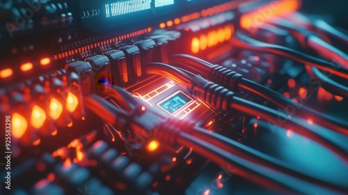 © sa-photo, Fototapeta premium A network switch with connected cables, glowing LEDs, and a digital display showing network traffic, symbolizing data management.