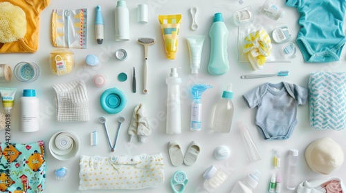 © chutikan, Naklejka premium A newborn baby lies surrounded by toiletries, toys and health care equipment. Protection and care on white background Includes pregnancy and baby shower shopping. view from above
