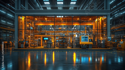 Fototapeta premium A next-gen industrial workspace with glass walls, AI dashboards, and...