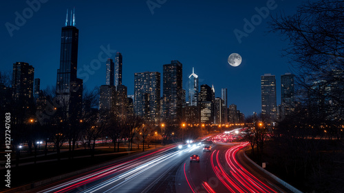 Fototapeta premium A night cityscape with skyscrapers glowing with lights, cars streaking past, and a full moon in the sky.