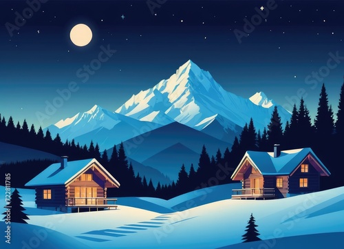 © SR Creative Idea, Fototapeta premium A night landscape in the winter mountains, adorned with chalet houses by ai generated