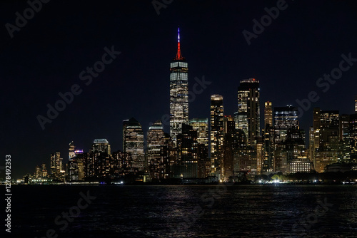 Obraz premium A night panorama of Manhattan downtown skyline, viewed from the river