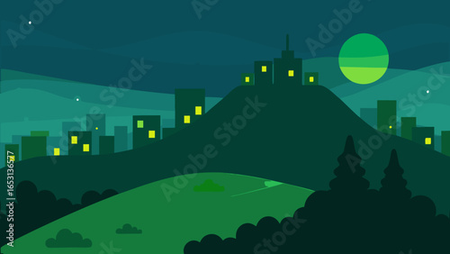 © Dalia, Fototapeta premium A Night Scene of a Green Hill Overlooking a City Skyline