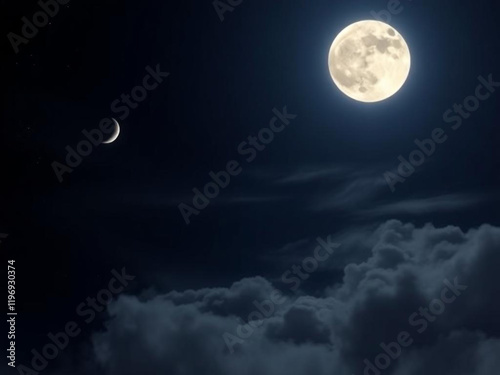 © Bassam, Fototapeta premium A night sky image displays a full moon shining over clouds, and a thin crescent moon