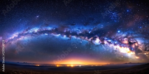© Kukar Studio, Obraz premium A Night Sky Panorama Featuring a Majestic Milky Way Galaxy Arcing Over a Serene Landscape with Distant Lights