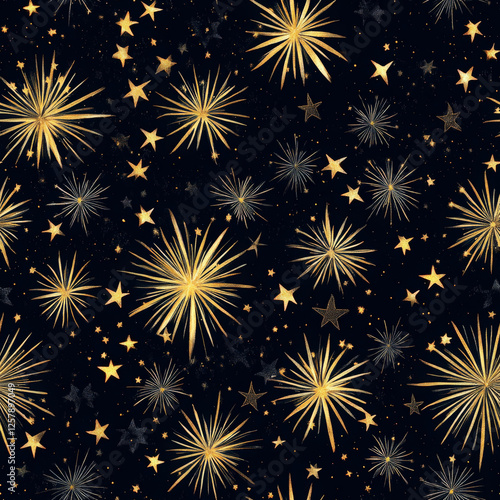 Naklejka premium A night sky pattern filled with golden fireworks and glowing stars