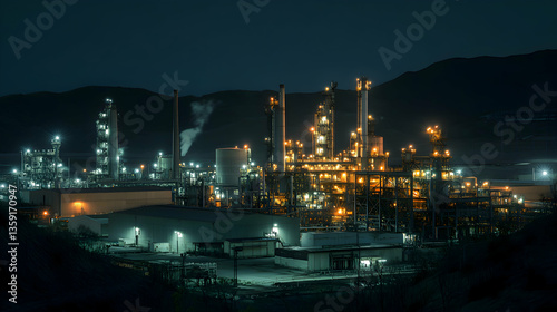 Fototapeta premium A night-time view of a sugar factory, its golden lights illuminating the...