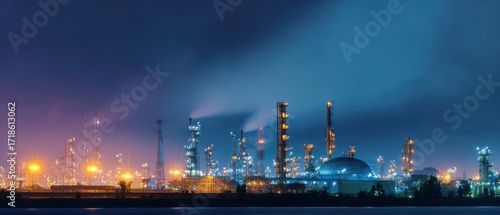 Naklejka premium A night view of an industrial complex with glowing lights and smoke,...
