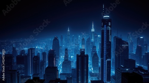 Obraz premium A nighttime cityscape illuminated in blue tones, showcasing skyscrapers and...