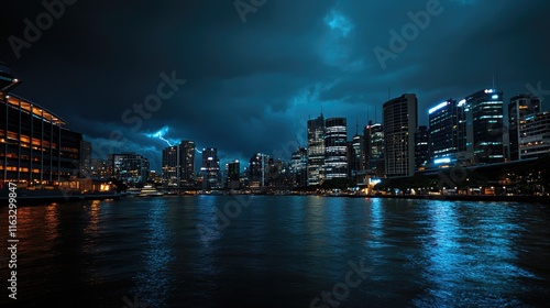 © ShinneProject, Fototapeta premium A nighttime cityscape reflecting lights on water under a moody sky.