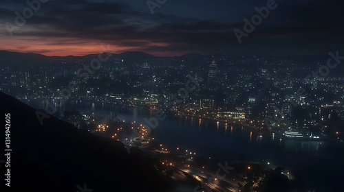 © Akkun, Fototapeta premium A nighttime cityscape with illuminated buildings and a river, showcasing urban beauty.