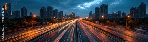 © pingpao, Fototapeta premium A nighttime cityscape with skyscrapers and highways, showing vibrant light trails from moving vehicles under a dramatic cloudy sky.