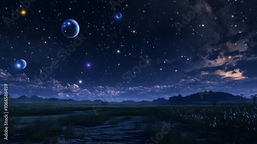 Fototapeta premium A Nighttime Landscape with Multiple Moons and Stars