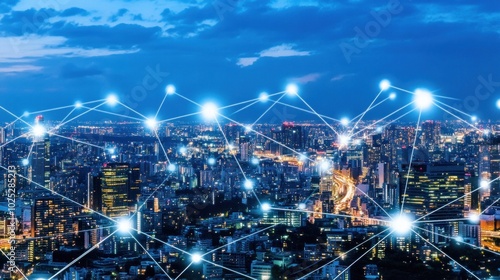 © upnowgraphics, Fototapeta premium A Nighttime View of a City Connected by a Network of Light
