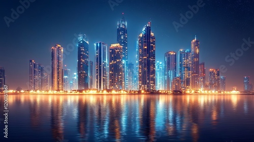 Fototapeta premium A nighttime view of a futuristic city featuring sleek, glowing skyscrapers....