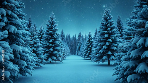© haloviss, Naklejka premium A nighttime view of many pine trees covered in snow in winter. The ground was covered in snow, which was beautiful at night.