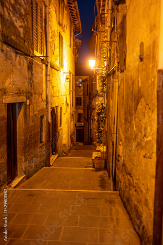 Obraz premium A nighttime view of Pitigliano, a charming Tuscan village perched on cliffs,...