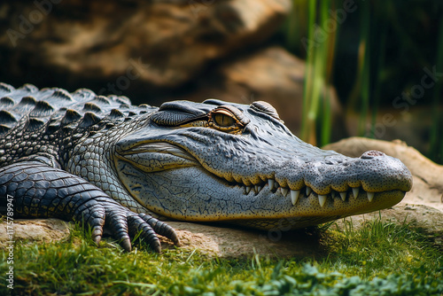 © Veronika, Obraz premium A Nile crocodile basking on the riverbank, with its massive jaw slightly open to cool off