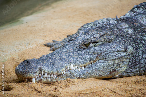 Fototapeta premium a nile crocodile lies on sand and looks out.