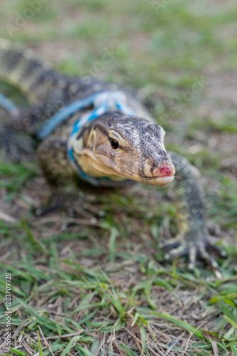 Fototapeta premium a Nile monitor lizard basking on a grassy field. The reptile's sleek, scaled...