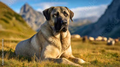 Obraz premium A noble Kangal dog watching over a flock of sheep, a beautiful and vigilant livestock guardian in a green meadow, a powerful shepherd dog in a scenic mountain landscape, a concept of loyalty and work.