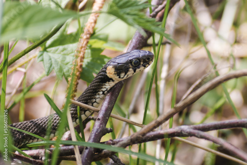 © Anna Skliarenko, Fototapeta premium A non-venomous snake crawls in green grass . It's Natrix natrix (grass, ringed or water snake).