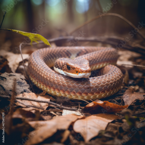 © mindstorm, Fototapeta premium a north copperhead snake on a forest floor.