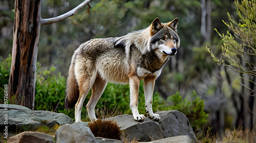 © Rezaul, Fototapeta premium A northwestern wolf stands confidently on a rock ai