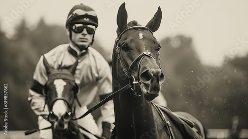 © Nawarit, Naklejka premium A nostalgic black and white photo style image of a historic racehorse race, with vintage clad jockeys and classic race attire