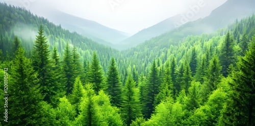 © Maxim Borbut, Obraz premium A nostalgic misty landscape featuring a fir forest in retro style. Stock