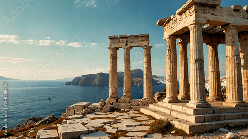 © Adrian Grosu, Obraz premium A nostalgic scene featuring a beautifully ancient Greek temple overlooking a serene blue sea