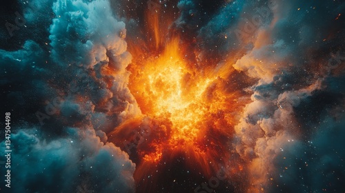 © Aisha, Fototapeta premium A nuclear explosion captured in slow motion, vibrant colors and shockwaves spreading
