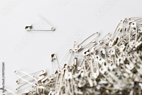 © janecocoa, Fototapeta premium A number of stainless safety pins on white background.