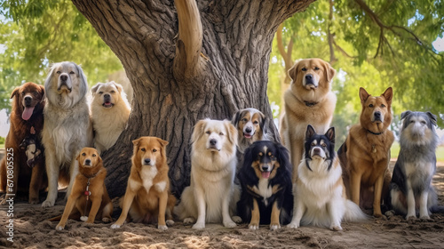 © JKLoma, Obraz premium A number of well-dressed dogs stand under a large tree and look at the camera.