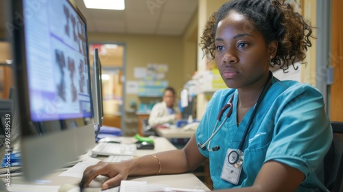 © Chanrothana Pech, Obraz premium A nurse reviewing electronic medical records on a desktop.
