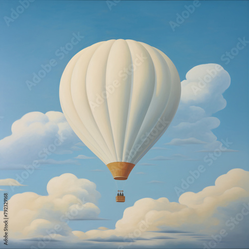 © Michael, Fototapeta premium a nursery, story book illustration, painting of a hot air ballon in puffy clouds muted whites, blues, tans. social media post, art,
