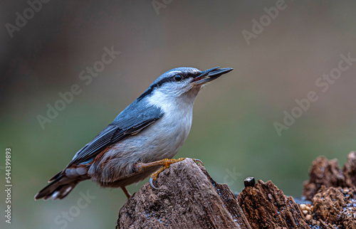 Fototapeta premium A nuthatch sits on an old stump and holds a sunflower seed in its beak.