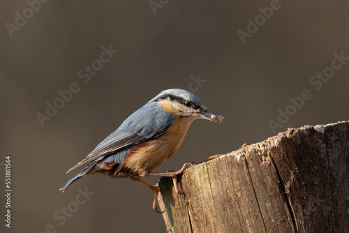 Fototapeta premium A Nuthatch (Sitta europaea) perched on a tree stump.