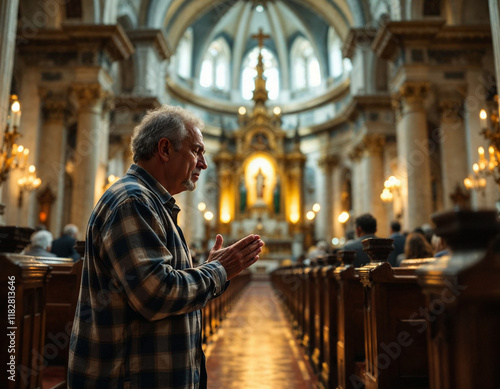 © arley_design, Naklejka premium A Old Man Praying in a Catholic Church