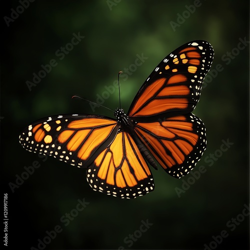 © Mariam, Fototapeta premium A orange monarch butterfly isolated on a dark forest green background